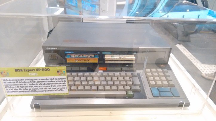 Ou ainda mais curiosos, como o MSX Expert XP-800, que era um misto de PC e videogame e que como esse exposto no Museu, poderiam até ter dois slots pra cartuchos. Isso tudo lá em 1985!