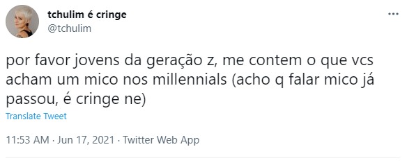 Recentemente viralizou uma série de tweets onde rola um ‘conflito’ entre Millennials e Geração Z. Acontece que a mais nova geração resolver apontar hábitos, situações e gostos da sua predecessora que eles acham estranhas/constrangedoras, ou como eles mesmos dizem, que eles acham cringe.