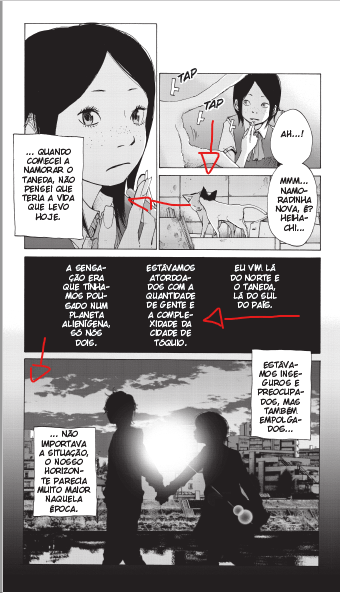 Foi um pouco difícil, a princípio, me acostumar com a leitura. A editora manteve a forma oriental de leitura, onde você lê os quadros da direita pra esquerda (e não o contrário, como nos quadrinhos ocidentais). Ainda tem o fato de eu não ser muito fã de quadrinhos em preto e branco e do formato menor me incomodar um pouquinho. Só que a arte é tão linda que compensa a falta de cores (em dado momento a gente simplesmente esquece que elas não estão lá). Sobre o formato falarei mais um pouco a diante. Então depois de meia dúzia de páginas já estava tudo ok.