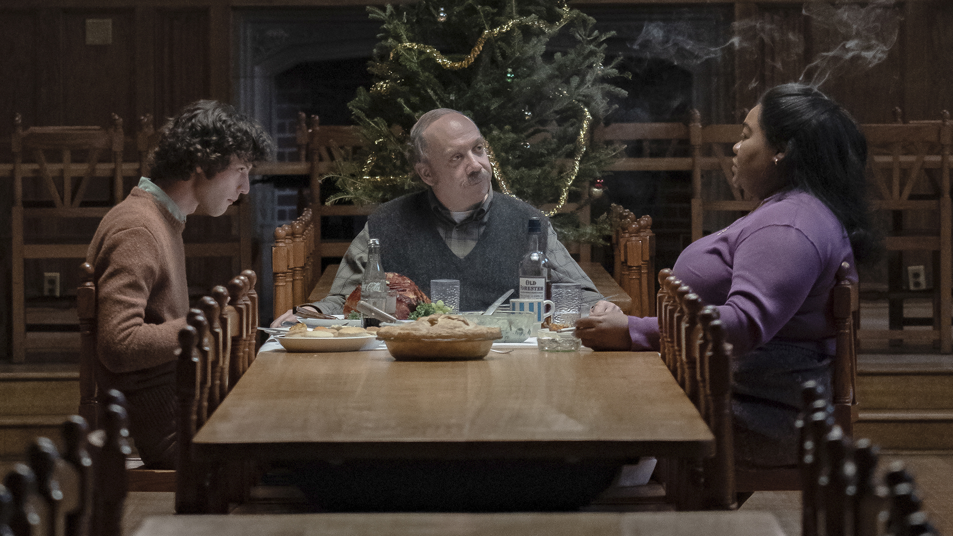 Paul Giamatti recebeu uma indicação como Melhor Ator ao Oscar por esse papel e ele é bastante merecido, sua atuação é impecável. O estreante (e surpreendente) Dominic Sessa está incrível como Angus, o aluno central, abandonado pela família nas festas de fim de ano: um cara legal fervendo sob uma superfície de dor e raiva. É aquele rebelde (aparentemente) sem causa por quem nos apaixonamos (e às vezes detestamos).